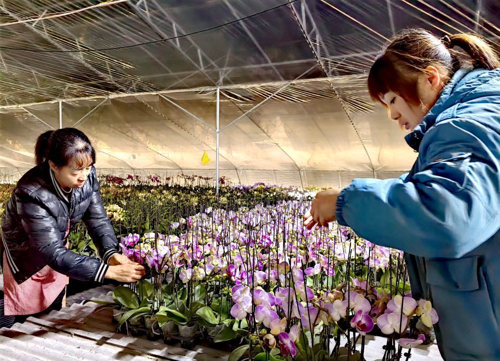图为“花匠”王曼(右)在杨凌示范区揉谷镇陵湾村的花坊内整理即将出售的蝴蝶兰。新华社记者 孙正好 摄